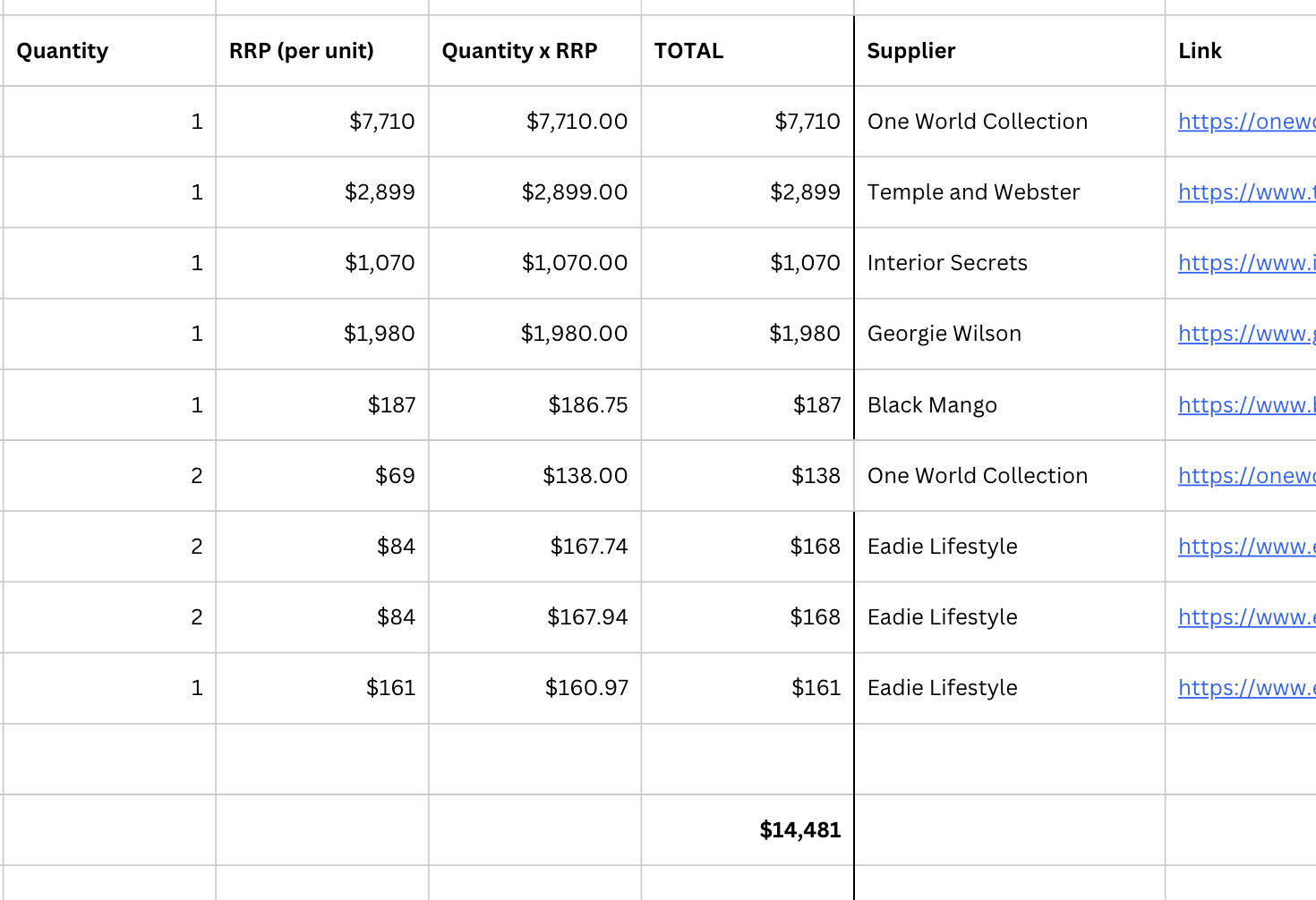 A comprehensive list of all items specified for the room, complete with direct purchase links, allowing you to shop at your own pace and in your own time.